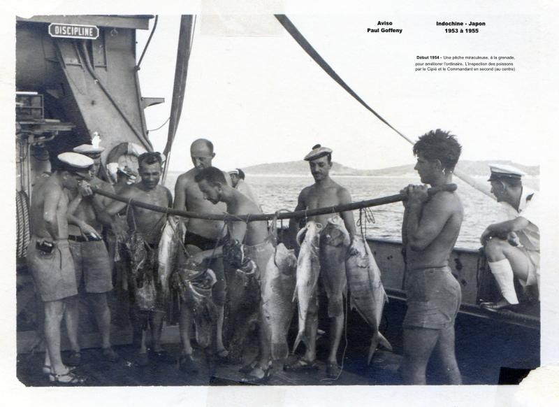Indochine - Japon - 1953 à 1955 Début 1954 - Une pêche miraculeuse, à la grenade, pour améliorer l’ordinaire. L’inspection des poissons par le Cipié et le Commandant en second (au centre