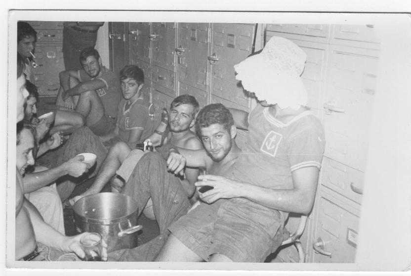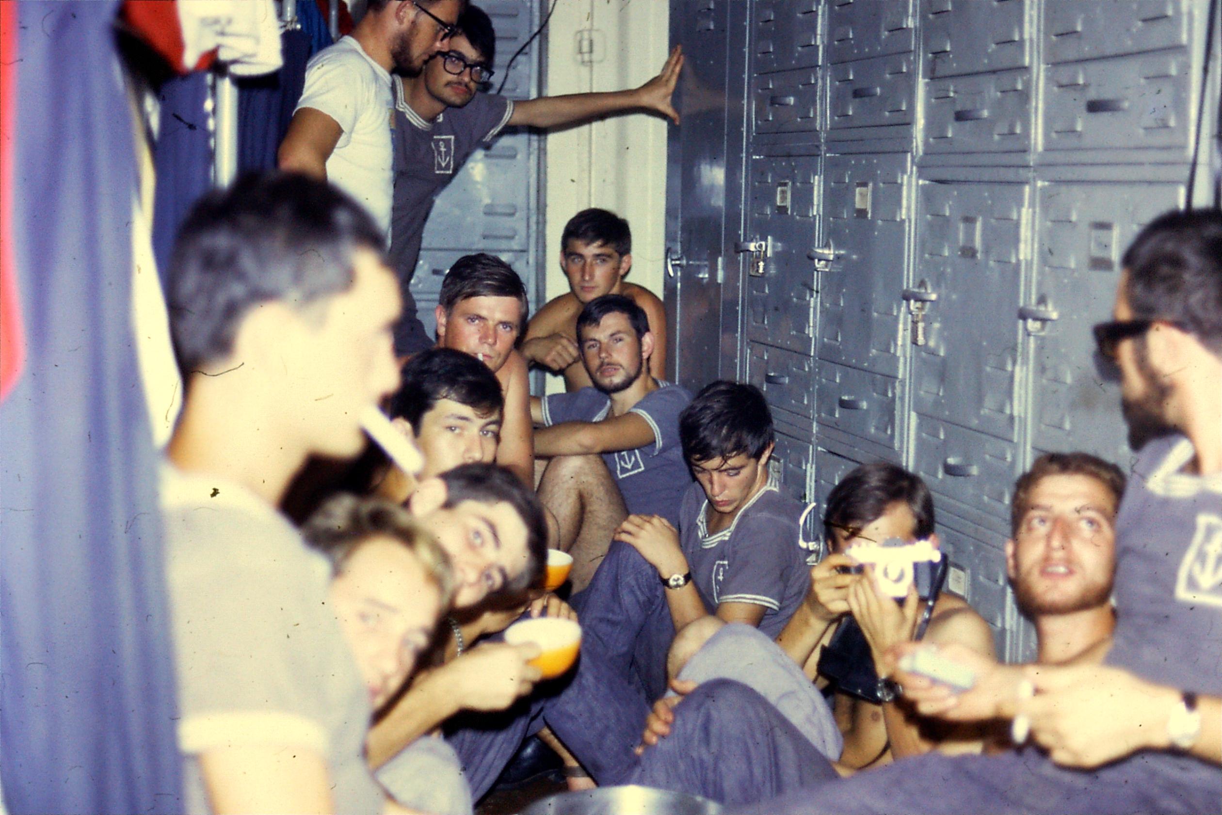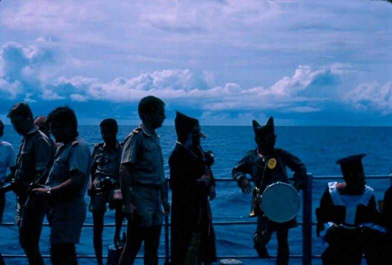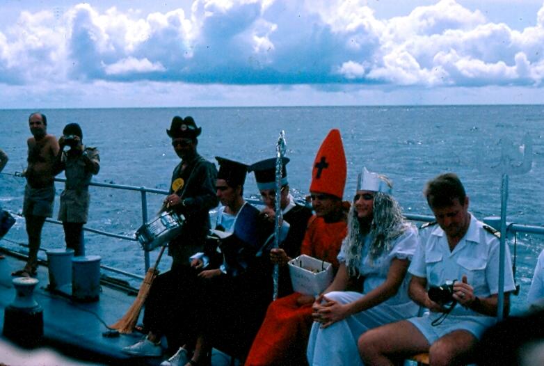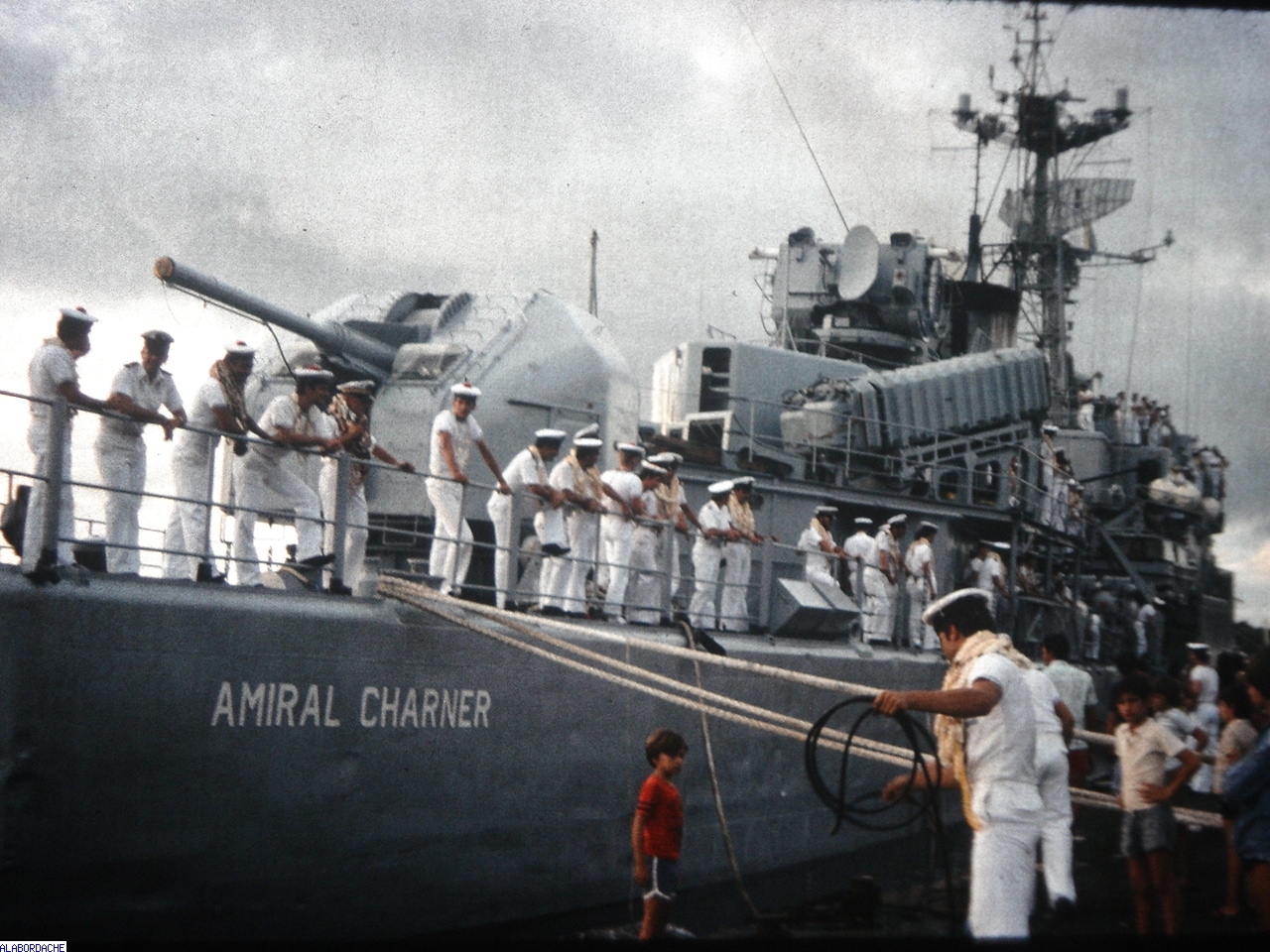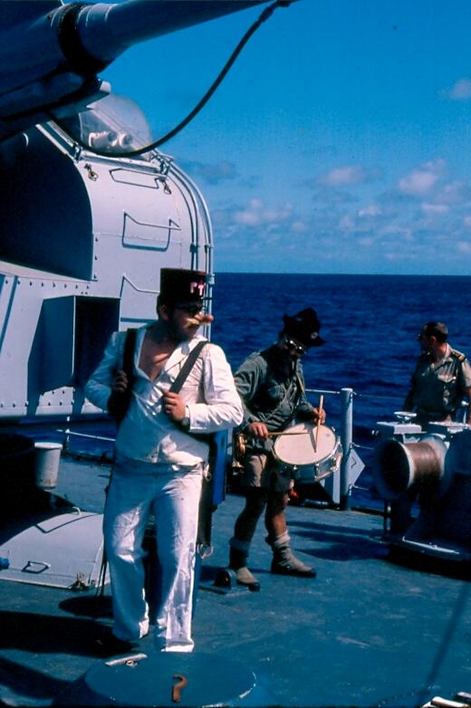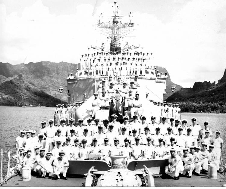 |  Les marins des services « Intérieur » et « Artillerie » de l'aviso-escorteur Amiral Charner au mouillage à Moorea, Polynésie française (Avril 1979 - Photo J-Pierre Monmasson).