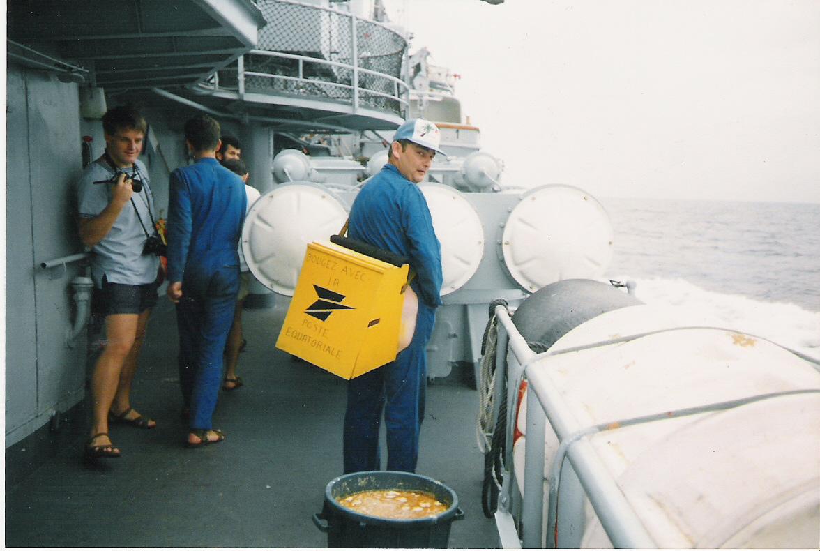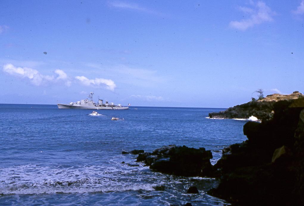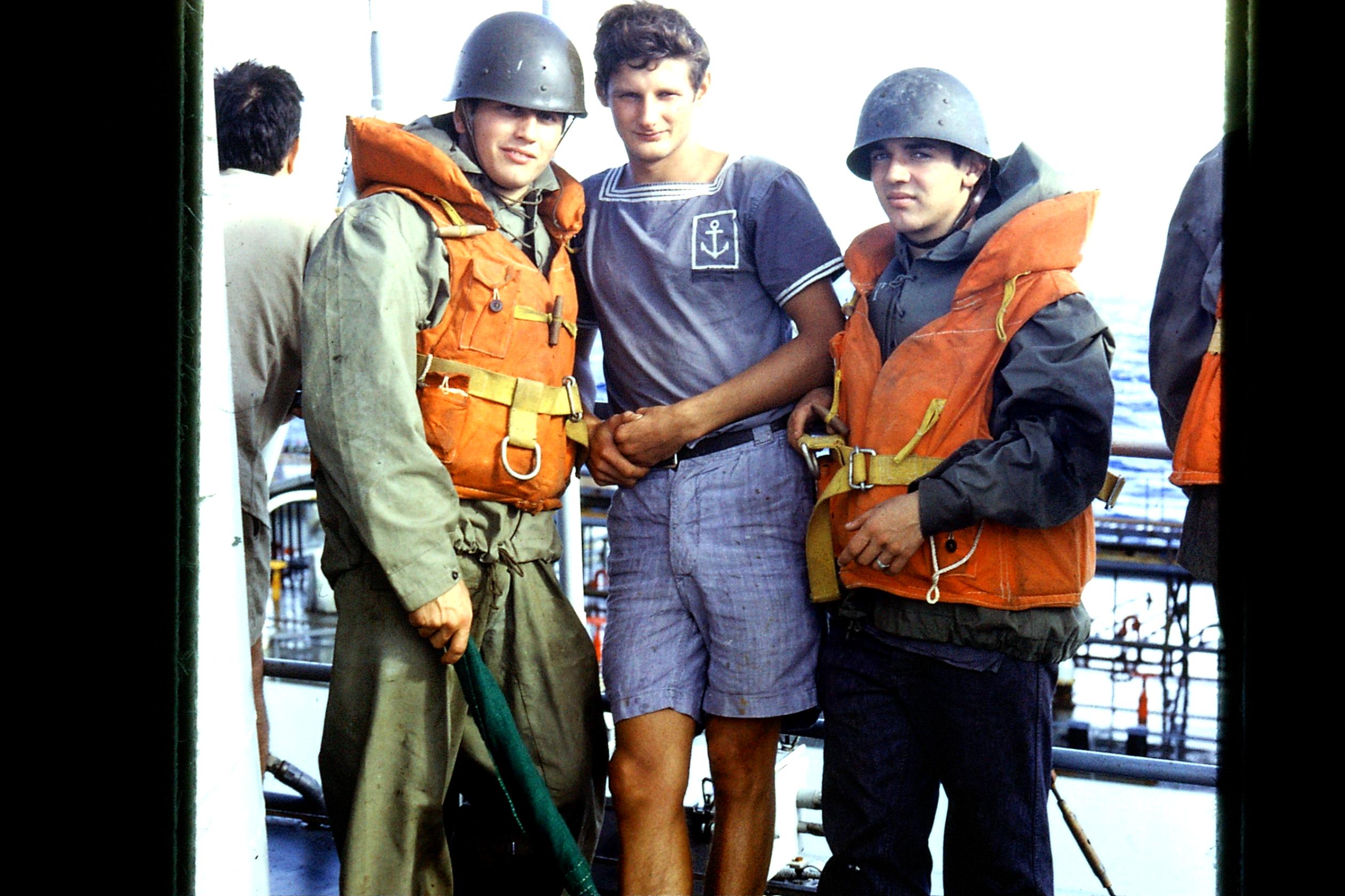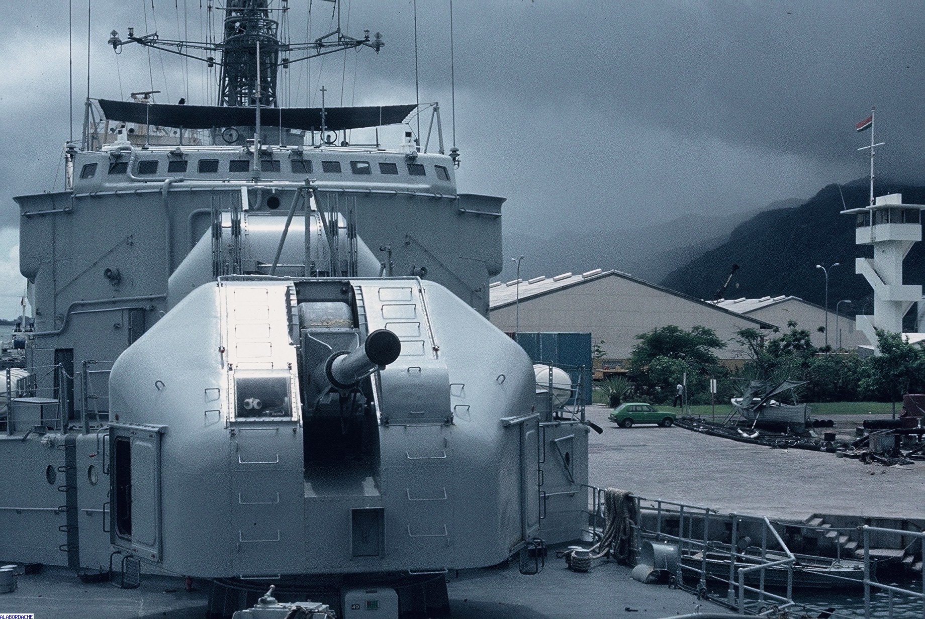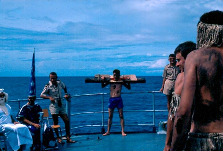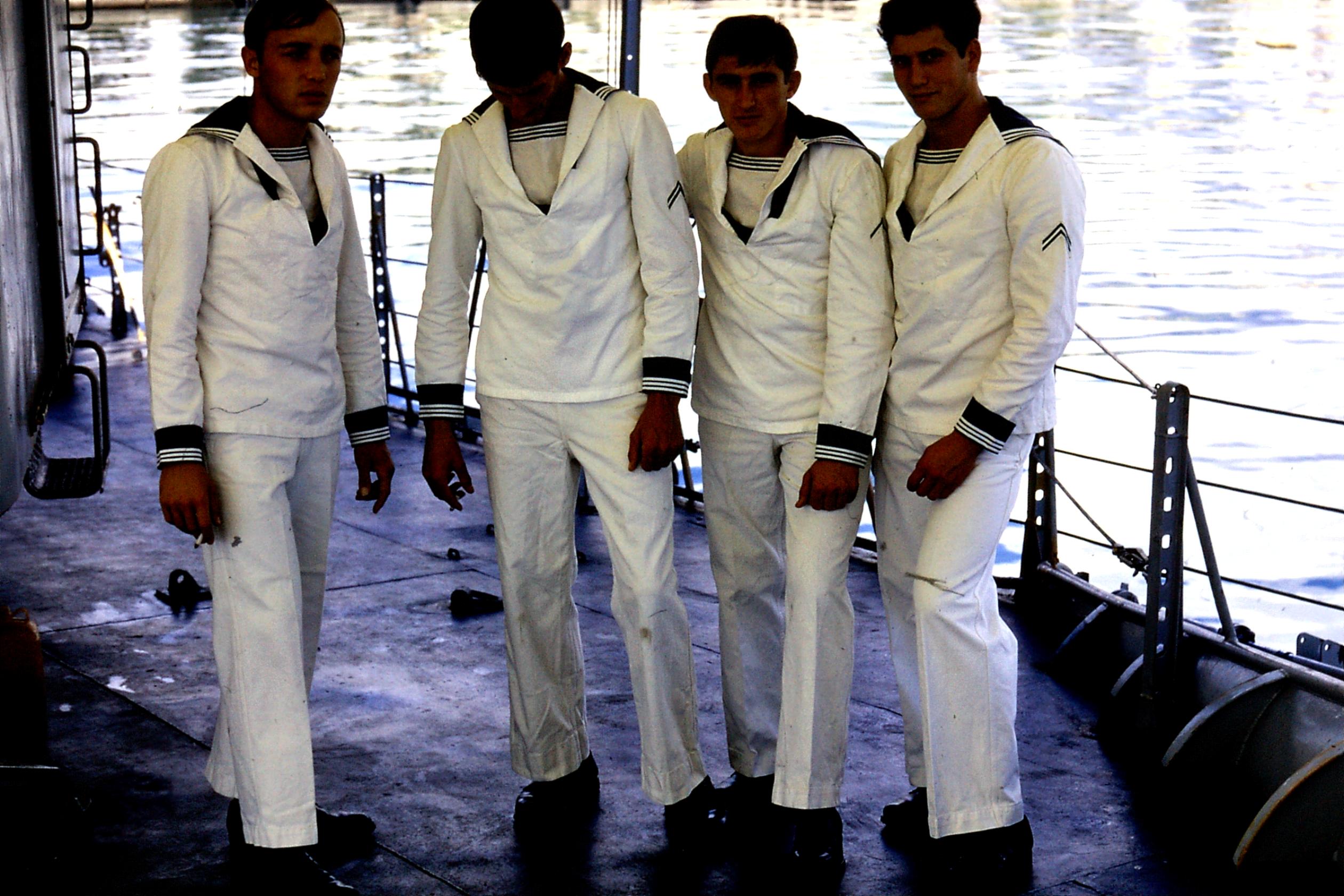 |  Les marins des services « Intérieur » et « Artillerie » de l'aviso-escorteur Amiral Charner au mouillage à Moorea, Polynésie française (Avril 1979 - Photo J-Pierre Monmasson).