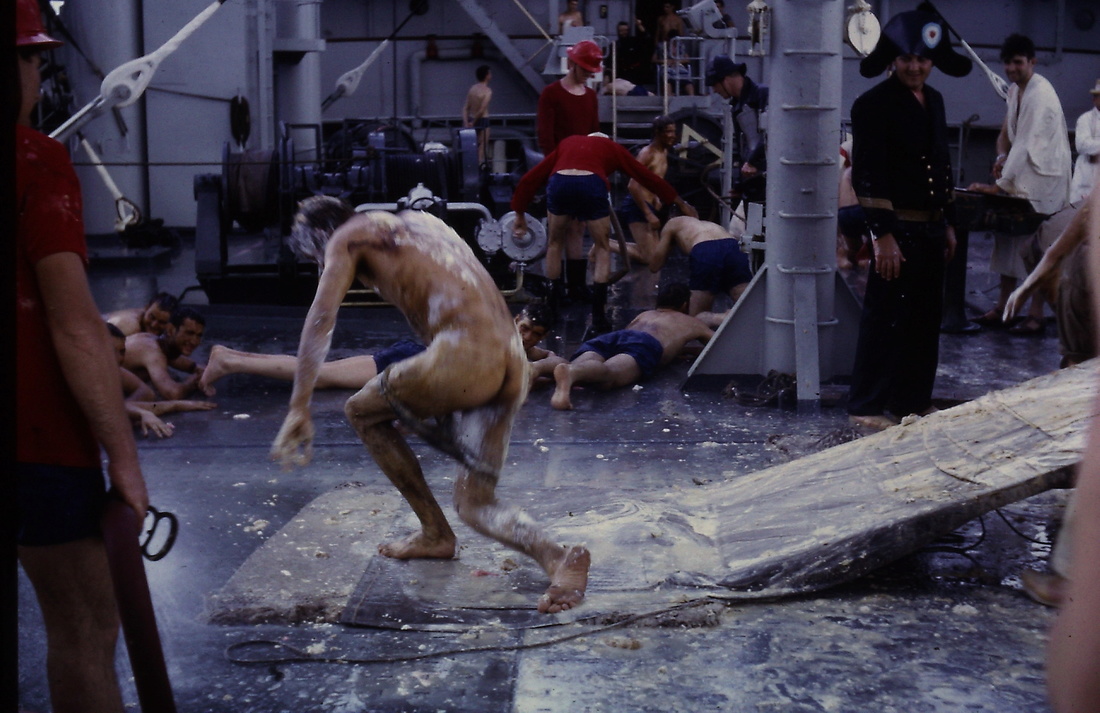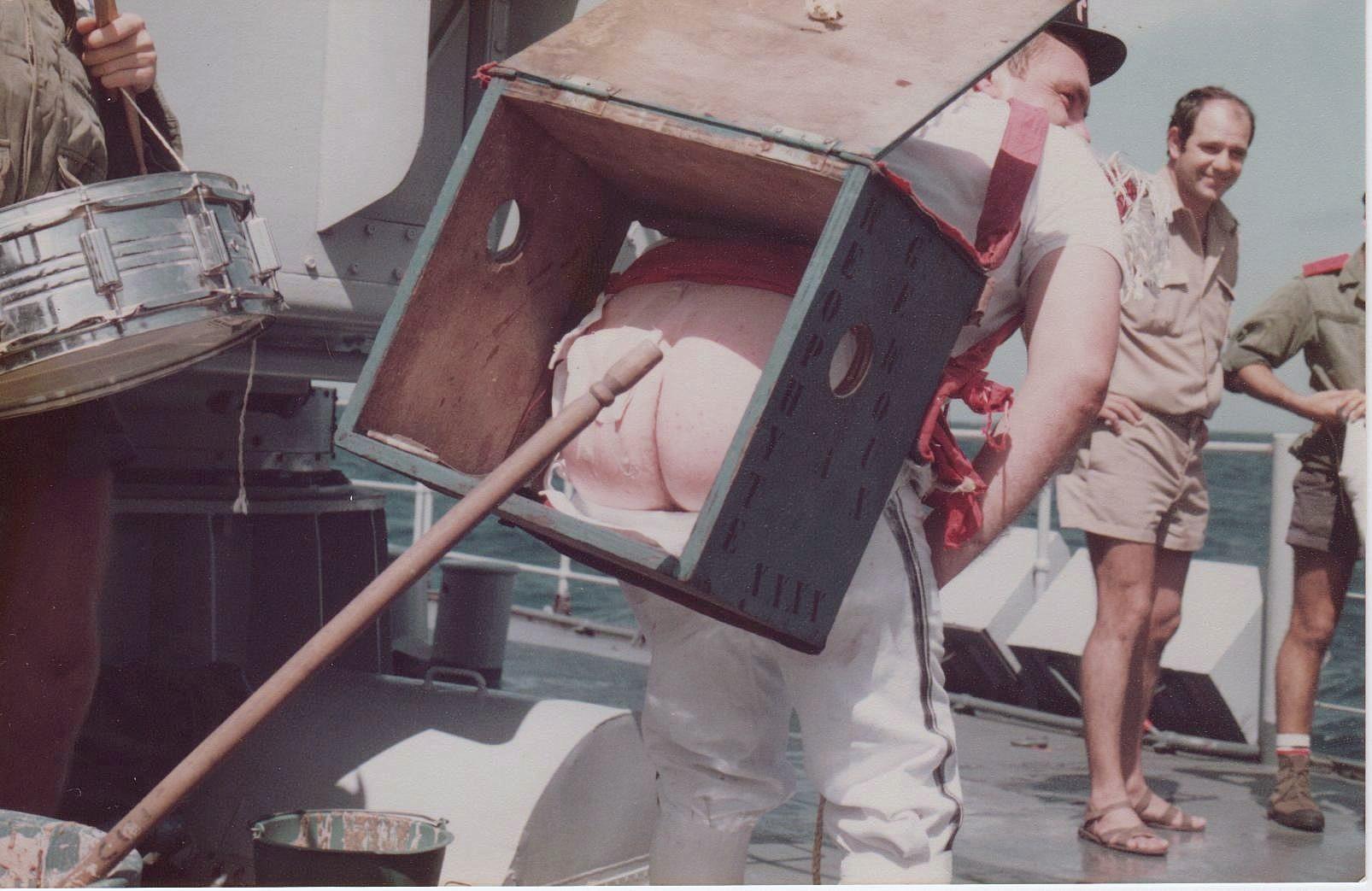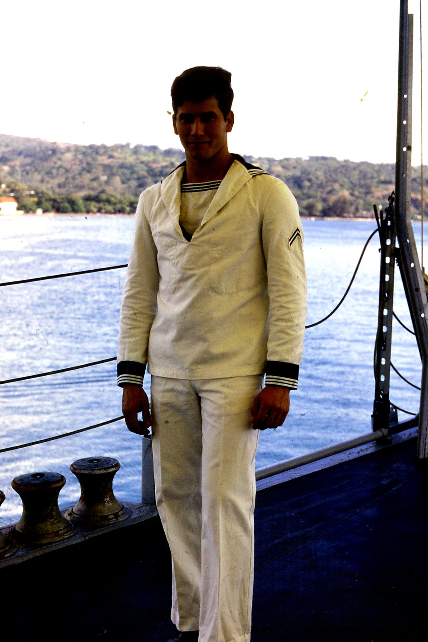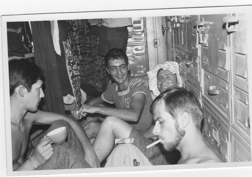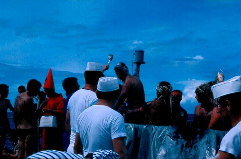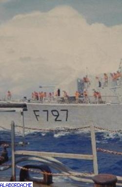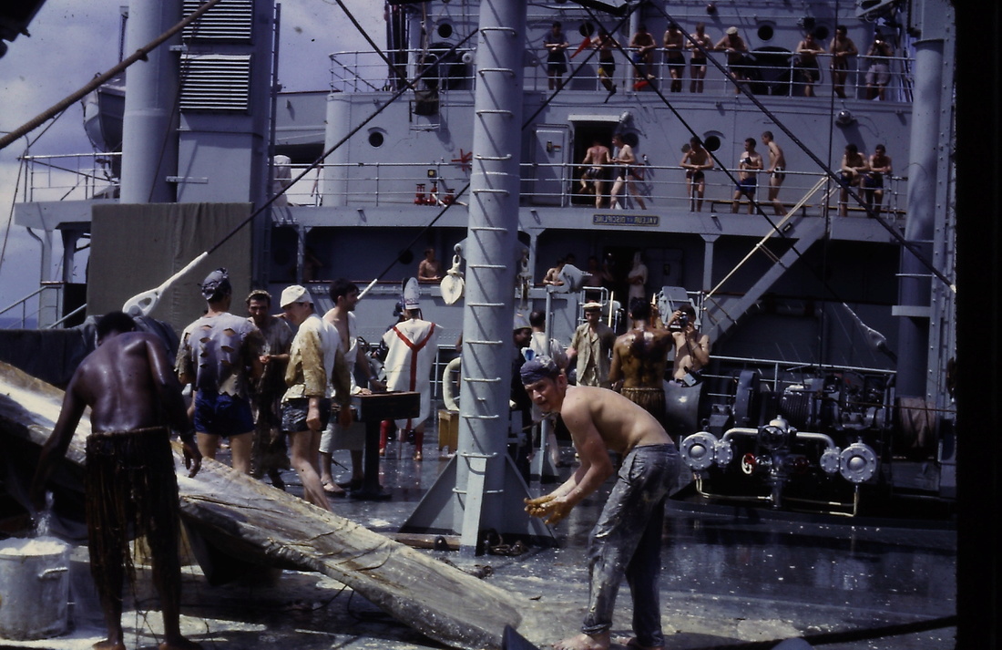 |  Les marins des services « Intérieur » et « Artillerie » de l'aviso-escorteur Amiral Charner au mouillage à Moorea, Polynésie française (Avril 1979 - Photo J-Pierre Monmasson).