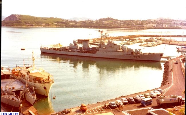 L'équipage de l'aviso-escorteur Amiral Charner au mouillage à Moorea, Polynésie française (Avril 1979 - Photo J-Pierre Monmasson).