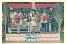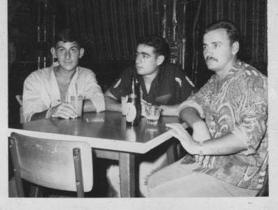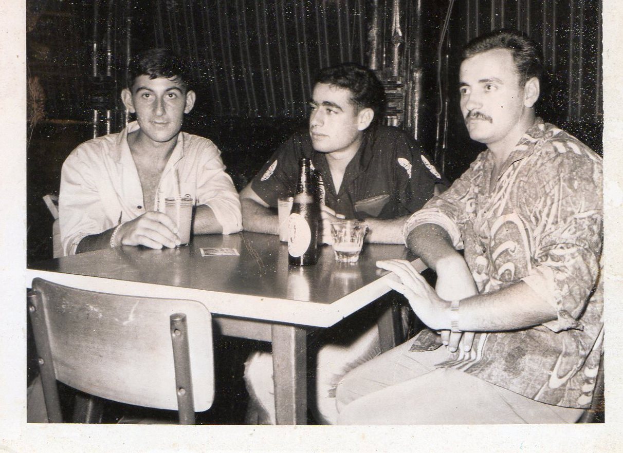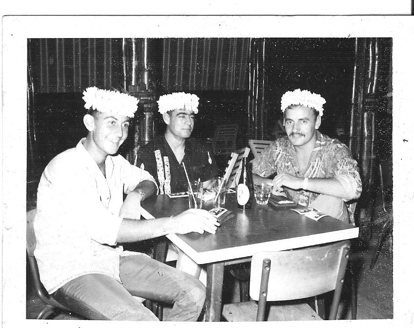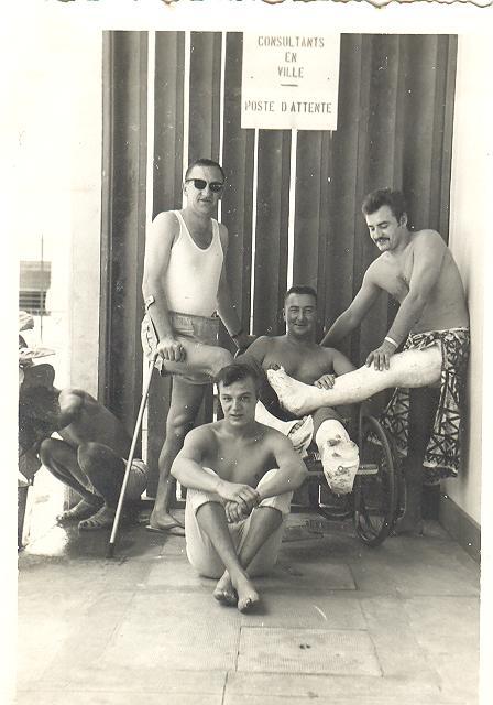 |  decembre 65 q m leleux jambe gauche dans le platre a droite contre le mur avec deux adjudants a terre q m questroy jacky tous a l hosto civil de papeete