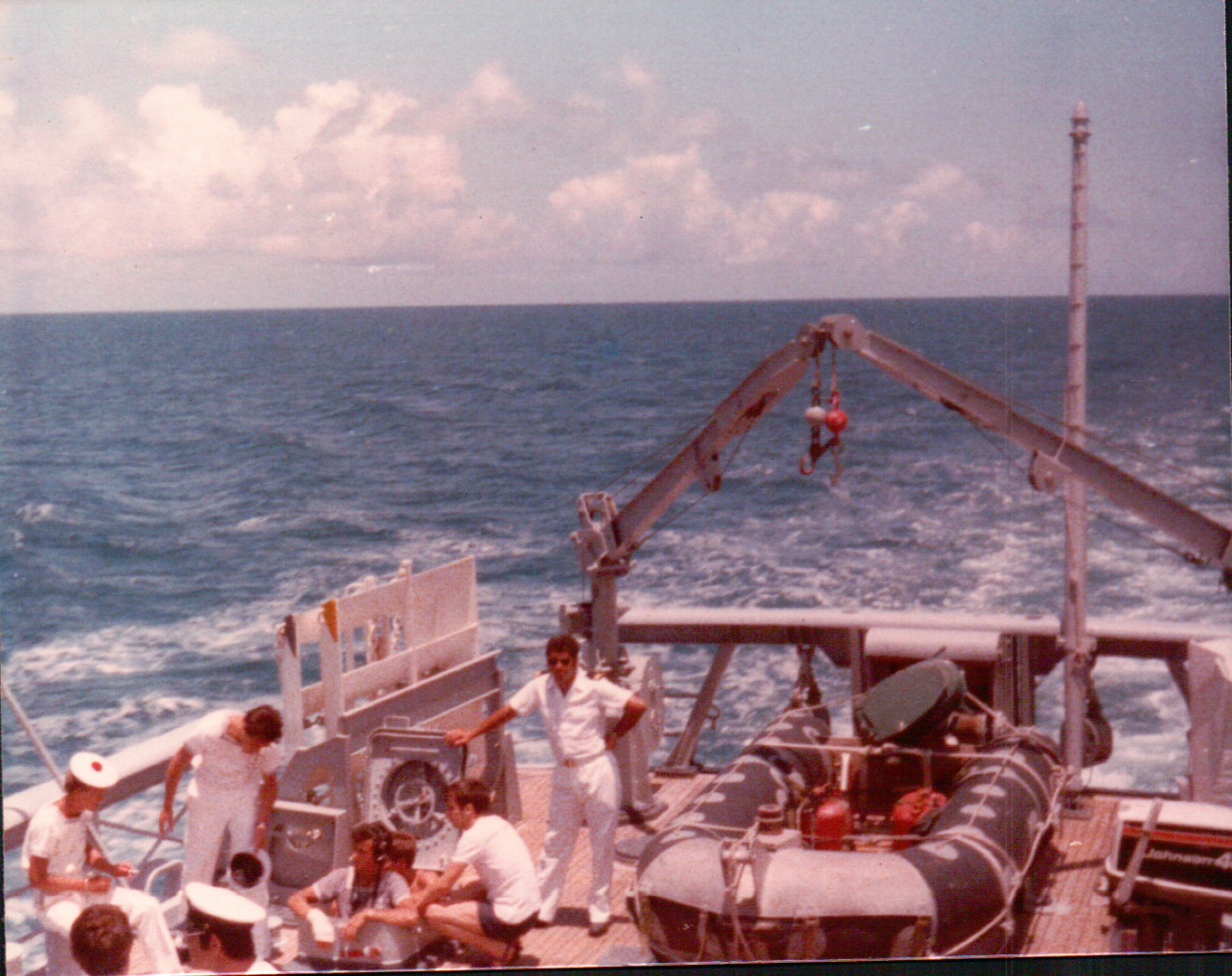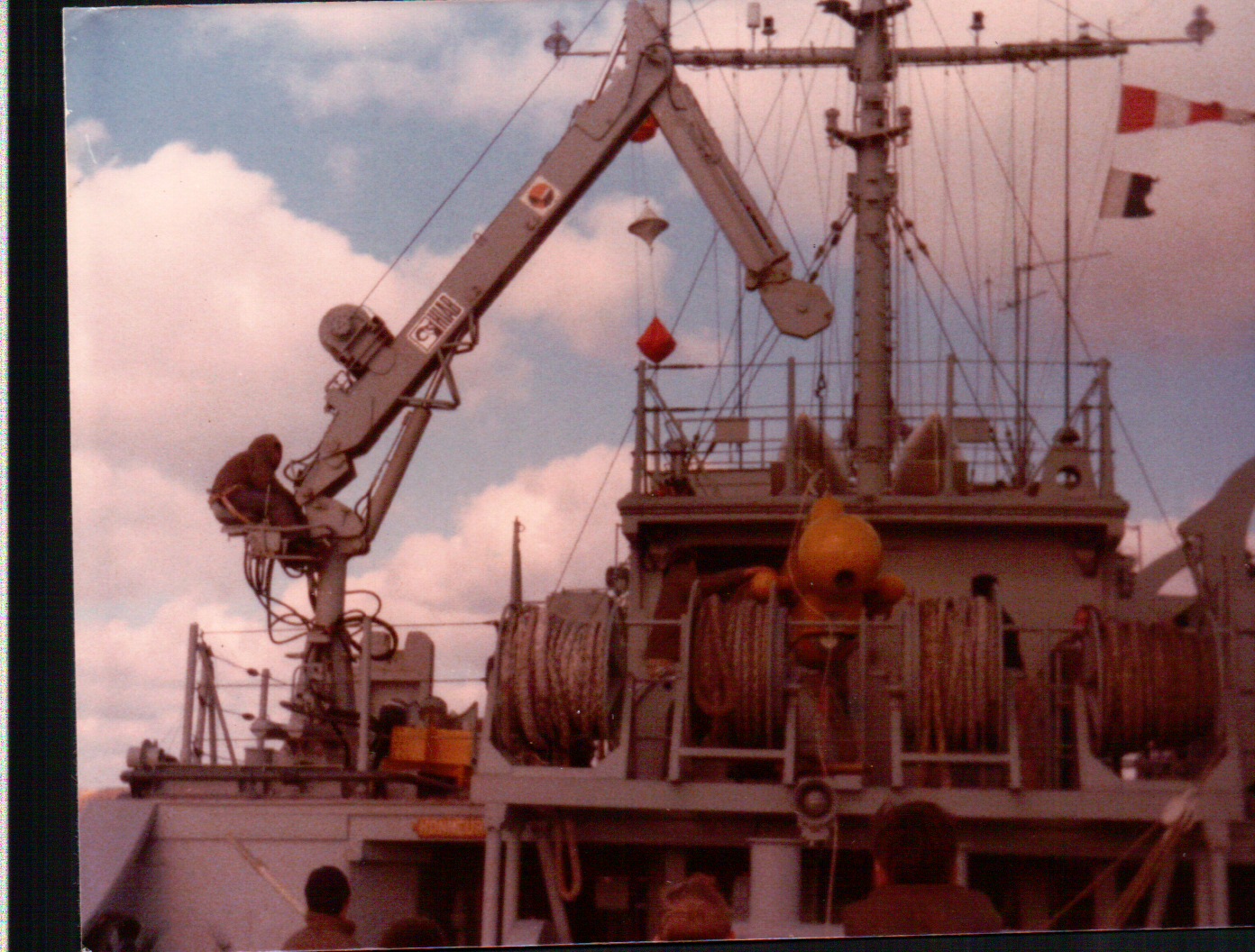 |  1977 - En Mer mise à l'eau du ''PAP'' (''Skubermor 2'' un sonar-poisson filoguide...)
