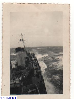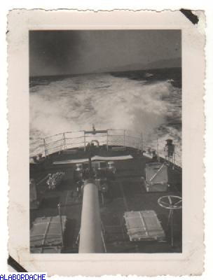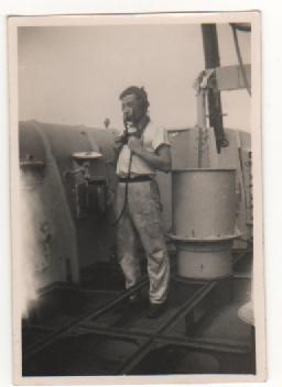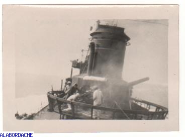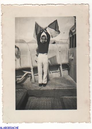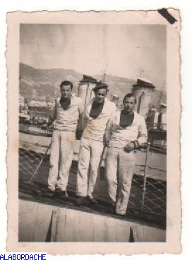 1938/1940 : 3 marins de l'Albatros sur la passerelle devant un projecteur de scott.