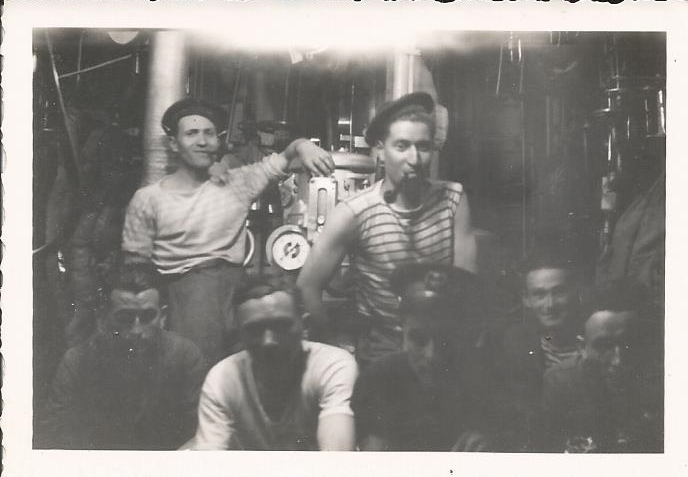 Salle des machines JEAN DE VIENNE. DAKAR 29/07/42. Collection ALENGRIN Joseph (au centre avec sa pipe)