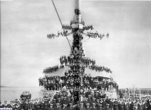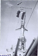 Le mat arrière du Lamotte Picquet. A la base du mat, l'horloge d'artillerie surplombe les 2 tourelles doubles de 155 mm.