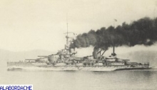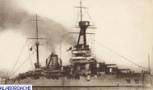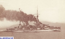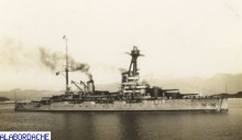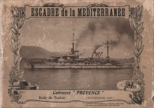La Provence en route toute à l'époque de son entrée en service. Le panache de fumée est impressionnant ainsi que la "moustache" (lame d'étrave) pourtant la Provence ne dépassera pas 20,5 noeuds aux essais. Même quand la chauffe au mazout aura remplacé la chauffe au charbon en 1934, sa vitesse maximum ne sera que de 21,5 noeuds. Cette transfomation profitera surtout à son autonomie...et diminuera la pénibilté du travail des chauffeurs. (commentaire Daniel Maurice. photo X DR)