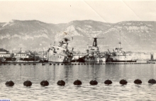 Après le sabordage de Toulon du 27 novembre 1942, le transport d'hydravions "Commandant Teste" gite sur babord. Le cuirassée "Provence" est coulé droit. Le vieux cuirassé "Condorcet " n'a pas été sabordé. Ponton caserne, il n'a plus aucune valeur militaire. (Commentaire Daniel Maurice. Photo X DR)