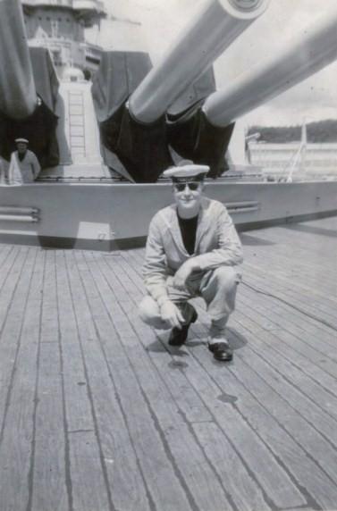Sur le Richelieu à Brest en 1960 sur la plage avant derriere le brise lames sous la tourelle des 380