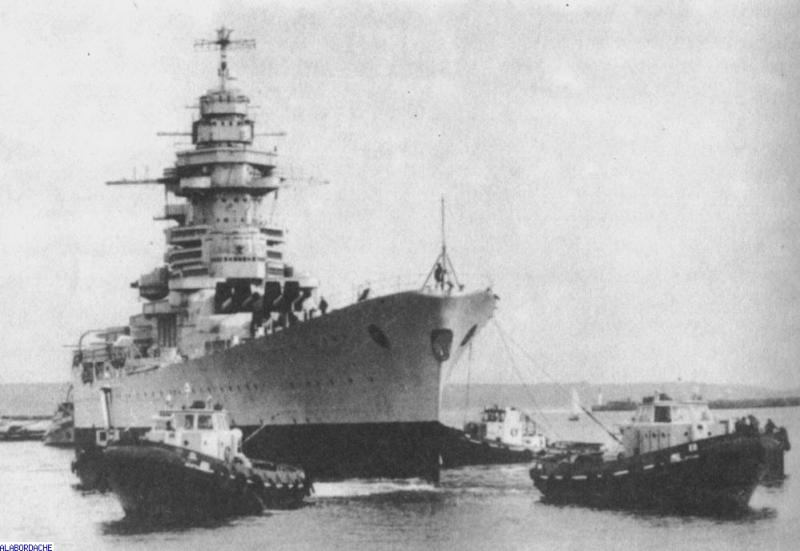 Le Richelieu quitte Brest pour son dernier voyage. Ironie du sort, ce glorieux combattant de la guerre du Pacifique qui lutta contre les forces du Mikado sera acheté par une societé de démolition japonaise et feraillé en Italie à La spezzia en 1968. (Commentaire Daniel Maurice. photo X)