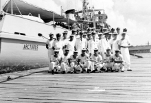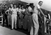 L'Arcturus en escale à Saint Thomas, le 16 novembre 1965. De gauche à droite : Gilbert, le garçon équipage. Les quartiers maîtres et matelots Le Vannier, Azzis, Deroches, Kerhevec et Sire. Les seconds maîtres Masson et Tarrieux. Enfin le maître principal Taupenot, chef mécanicien. (Photo : Jean Pierre Vitière)