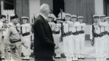 20 juillet 1967 : Après sa visite à Saint Pierre, le général deGaulle quitte l'Arcturus pour embarquer sur Le Colbert et continuer son voyage vers le Québec. Une dernière poignée de mains au lieutenant de vaisseau Albouy, commandant l'Arcturus. Au premier le QM2 Maneu Léotard, gabier siffleur, Derrière lui le "bosco", le MT Maneu Féger. (Commentaire Maurice - Photo : Fabre)