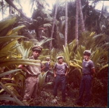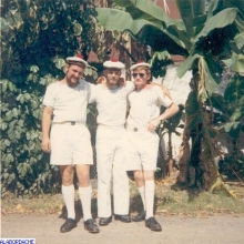 1971 Jean-Jacques QM2 radio au centre, sur l'ile du Diable pour aller nettoyer le cimetière, mon copain Dufeil Daniel mecano plongeur démineur à droite et un jeune midship
