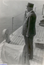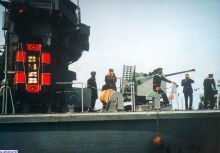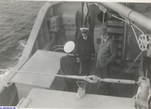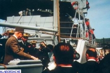 Saint Pierre et Miquelon, le 20 juillet 1967. Le général De Gaulle sur la plage avant de l'Acrturus à bord duquel il a hissé sa marque de commandement pour se rendre du croiseur Colbert, à terre à Saint Pierre. J'ai oublié qui est le quartier maître qui tient la défense. De dos, au guindeau, le matelot électricien Jean Claude Grimard.