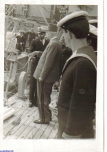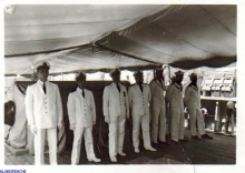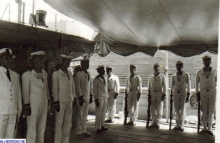 Saint Pierre et Miquelon, le 20 juillet 1967. Le général de Gaulle à bord de l'Arcturus : La garde d'honneur, au premier plan le SM mécan. Maurice Celeste, le QM1 mécan. Jean jacques Rousseau (Non pas le philosophe...mais l'autre beaucoup moins connu. Jean Jacques était , surnommé "la clape" car il dévorait comme un chancre mais était maigre comme un clou...! , puis le QM1 infirm. Gabriel Chicky.