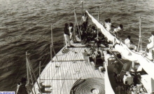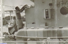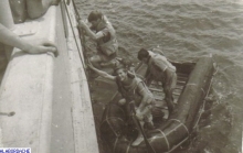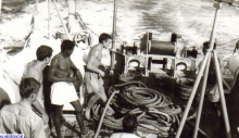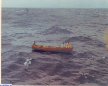 1er janvier 1968 : La yole ronde en perdition, de Mr Georges Sablé et son fils âgé d'une quinzaine d'années, est retrouvée et les malheureux marins pêcheurs martiniquais sont ramenés à bord par le youyou de l'Arcturus. Au moteur, le QM1 maneu Le Maguer (Photo Kristofic)