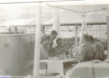 1967 : Bizutage de l'aspirant Mollet à son embarquement, sous forme de jeu de rôles. C'est notre pacha, le LV Albouy qui tient le rôle 'du motel. (Pour la circonstance, il est un ancien légionnaire particulièrement maladroit à qui il ne faut pas se frotter et qui se montrera particulièrement irrespectueux à l'égard du jeune aspirant...). A sa droite le "vrai" motel, le QM1 Gauthier à pris la place de l'officier en 3ème. L'EV2 Baillot a été promu officier en second. En face du "pacha-motel", l'EV1 Renard, pseudo commandant. Monsieur Renard, disparaitra avec la Minerve le 27 janvier 1968. Tout ceux de l'équipage regretterons leur officier en second, meneur d'homme efficace mais toujours souriant et particulièrement humain. A côté de lui, l'aspirant Mollet qui semble bien étonné par ce curieux état major. "Sur quelle galère me suis je embarqué ?" doit il se demander ... (Commentaire : Maurice. Photo: Fabre)