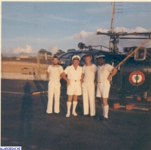 1968 : Visite de la Jeanne d'Arc, mouillée en baie de Fort de France, devant une "Alouette 3". Je suis le barbu en short. A coté de moi le QM1 Hervé Vauthier, ancien mousse, qui terminera une carrière exceptionnelle comme contre amiral (2S) et le MP Maneu Séguillon que je retrouverai sur la Saône en 1970. L'autre marin barbu faisait partie de l'équipage de la "Jeanne". (Photo : Le Maguer. Commentaire : Maurice)