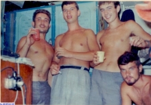 Sur la plage avant de l'Acrturus. Le barbu, la clope au bec, torse nu exposant ses abdominaux "Kronenbourg" c'est moi, avec 3 copains de l'Altaïr. (commentaire : Daniel Maurice)