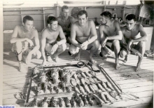 1968. Pêche miraculeuse aux îles Vierges :De gauche à droite, l'EV1 Aublet, le QM1 mécan Coupel, le Mlot charp Hunterzinguer, le MT mécan Bastiera, le QM2 maneu Kristofic et le Mlot motel Sangol.