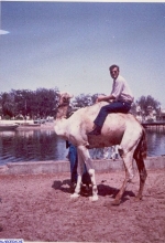 1969 : Détente à Dakar. Lucien Kristofic sur le dos d'un dromadaire, après une traversée historique de l'Arcturus, de Récife (Brésil) à Dakar (Sénégal)