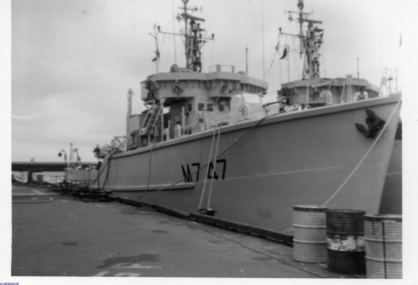 1972 : La Betelgeuse amarrée au quai des flotilles à Brest. La Betelgeuse, à l'époque, n'était plus endivisionnée mais servait de bâtiment d'expérimentation pour la Commission d'Etudes Pratiques de la Guerre des Mines (CEPGM). (photo X)