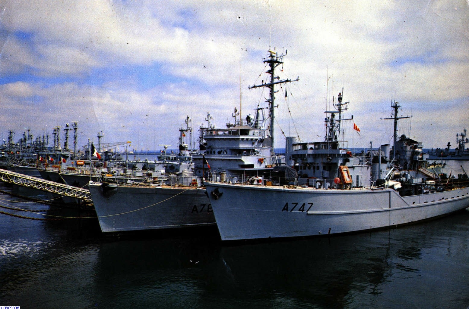 1975 : Brest. La Betelgeuse à couple du Narvick, accostés au quai des flotilles, quand ces 2 dragueurs étaient aux ordres de la Commission d'Etude Pratique de la Guerre des Mines (CEPGM). Leur indicatif visuel Otan ne comporte plus le M (Minesweeper) des dragueurs de mines, mais le A (Auxilary) des bâtiments auxiliares. (Photo X. Commentaire Daniel Maurice)