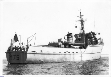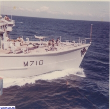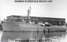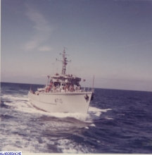 Début 1967 : Le Denébola au mouillage sur la côte landaise, devant le CEL implanté à Biscarosse. Il possède encore toutes ses capacités de dragueur de mines et n'est pas encore grée pour le chalutage. On distingue sur le tribord du youyou la drague AM1 modifiée (Acoustique à Marteau ) et sur la plage arrière, les cochonets de dragage qui très bientôt céderons leur place à des panneaux de chalut.