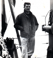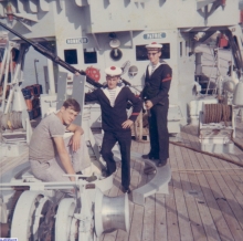 1967 : Le quartier maître Jean Osa assis sur le caisson à pavillon babord, sur la passerelle du Denébola. Naviguant de conserve, le Pégase.