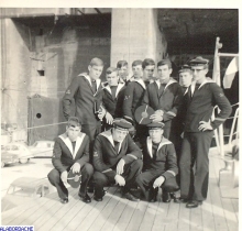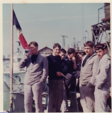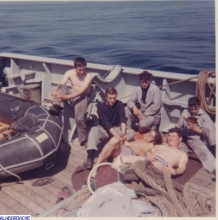 1967 : Quelques hommes d'équipage du Denébola : De gauche à droite le Mlot motel Trubert (avec la cigarette), le Mlot cuisi Avernin, le Mlot mécan Hurbé, le Mlot élect Barnier, le Mlot missi Fauvel (décédé) le Mlot mécan Loeil et le QM2 équip Osa (avec son bacchi). (Photo : collection Jean Osa)