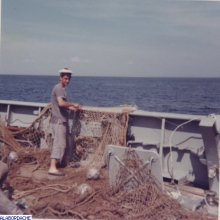 1967 : Le QM2 équip Jean Osa ramande un chalut. Jean Osa qui était inscrit maritime, marin pêcheur à Saint Jean de Luz , avait été débarqué du Maillé Brezé pour embarquer début 1967 sur le Denébola. Sa mission : Participer à l'expérimentation du repêchages des CT 20 et autres missiles tirés du CEL en chalutant avec des filets de pêche. Cette méthode s'est averée probante puisque pendant une dizaine d'années, c'est grâce à elle, mais aussi au précieux concours des inscrits maritimes de la pêche, que les dragueurs de mines côtiers de La Pallice (reclassés ensuite patrouilleurs côtiers) ont rempli leur mission. (Commentaire : Daniel Maurice. Photo : Collection Jean Osa)