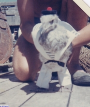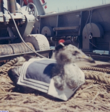 1967 : Curieux marin que cet oiseau...Ca marche aussi à l'envers car cet oiseau est un bien curieux marin. Il s'agit d'une mouette que Jean Osa avait attrapé au Fort Boyard quand elle n'était encore qu'un poussin. Apprivoisée, elle vivait à bord et ne tentait même pas de s'échapper. (commentaire : Daniel Maurice. Photo : collection Jean Osa)