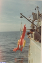 1967 : Repêchage d'un CT 20 à l'aide du mat de charge babord. De dos, le MT élect Le Guen ("Mon noeud"). Le MT Le Guen, patron électricien, était très sympathique mais il avait pour fâcheuse habitude de répondre systèmatiquement dès que nous lui posions une question ou lui demandions quelque chose : "T'as qu'à d'mander à mon noeud". Le sobriquet de "Mon noeud" lui est resté. Sur l'aileron de la passerelle, au dessus des bouées "Vialet-Chabran", le QM2 détec Ars. (commentaire Daniel Maurice. Photo : collection Jean Osa)