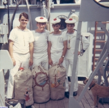 Août 1967 : "0 au jus, la quille". Le Mlot secre Secco, le Mlot élect Barnier, le QM2 équip Osa et un "quillard" de la Bellatrix quittent le bord... Après 16 mois de service militaire chacun va Rentrer Dans Ses Foyers (RDSF comme on disait à l'époque). Pollux, la mascotte du Denébola a le regard nostalgique. Le brave chien a bien compris qu'il va perdre 3 de ses gentils maîtres. (commentaire : Daniel Maurice. Photo : Collection Jean Osa)