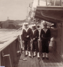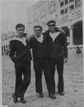 Mai 1967 : Escale à Pasajès. En bordée à Saint Sébastien. De gauche à droite, le QM1 mécan Pinel, le Mlot gabier Caillet et le Mlot élect Magret.