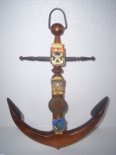 La quille du quartier maître équipage Jean Osa, certifié aide timonier .Sur la verge de l'ancre, ses différentes affectations. De haut en bas : L'insigne du CFM Hourtin et celui de l'école des timoniers implantée au fort du cap Brun à Toulon, celui de l'escorteur d'escadre Maillé Brezé, basé à Toulon. Enfin l'écusson de la 2ème Esdra de Brest à laquelle était rattaché la 24ème Didra à La Pallice, dont le Denébola était le chef de division. (Photo : Jean Osa. Commentaire : Daniel Maurice)