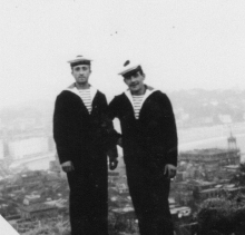 Mai 1967 : Permissionnaires à Pasajès : A gauche, le Mlot Caillet, marin pêcheur à la Rochelle. A droite, le QM2 Augereau, également marin pêcheur mais sur l'île d'Yeu.