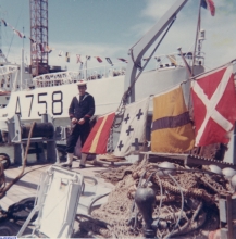 8 mai 1967 à La Pallice : Le grand pavois est hissé pour célébrer le 22ème anniversaire de l'armistice avec l'Allemagne, de la seconde guerre mondiale . Le QM2 Jean Osa est de quart à la coupée. Accosté derrière le Denébola, le bâtiment hydrographique La Recherche (A758) qui relachait régulièrement à La Pallice au cours des ses missions hydrographiques dans le golfe de Gascogne.