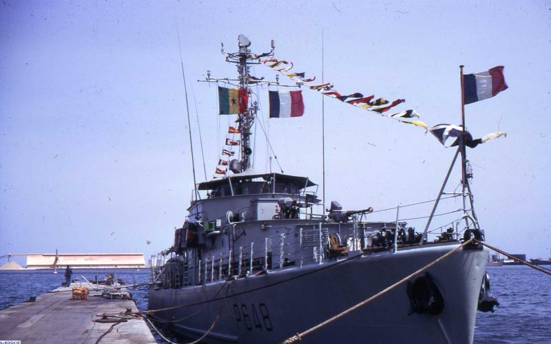 4 avril 1970 : Le Hardi à quai à Dakar. Il arbore le grand pavois à l'occasion de la fête nationale de la république du Sénégal. (photo : Patrick Dautancourt)
