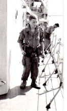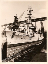 1956-57 : Le matelot Guillot André (matricule 33808 T 55) sous une des deux hélices du Guichen au bassin.