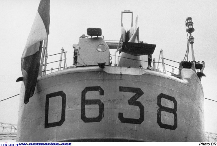 |  Après mise en place du bulbe sonar d'étrave, la plage avant a été allongée pour mettre en place une ligne de mouillage dans l'axe, en conservant celle de babord Photo prise par Guy Bouat à Lorient en1960/61