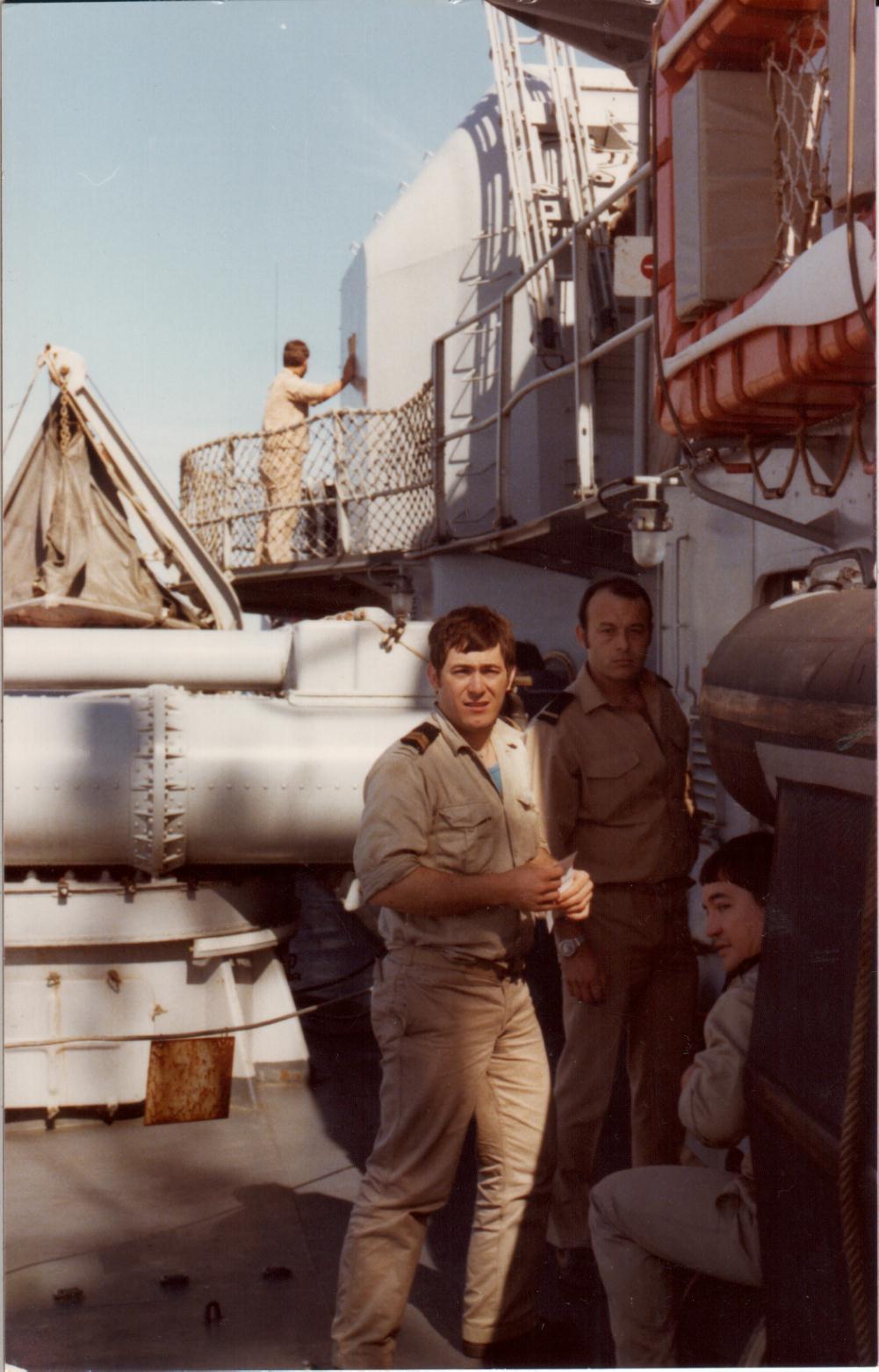 Trois mécanos qui prennent un peu d'air frais a la sortie des machines Ce n'est pas du luxe surtout en mer rouge,