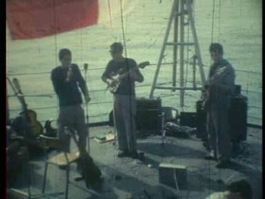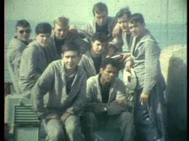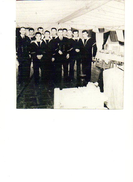 |  Equipe de réception du Béarnais. Faisant office de commis j'étais le responsable avec le ''toubib'' de l'accueil des invités à bord et je m'entourais de copains évidemment. A Weymouth lors d'un des premiers voyages inaugural nous avons ramené à terre la fille dumaire qui avait un peu trop abusé de champagne ! septembre 1958 ?