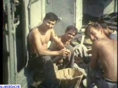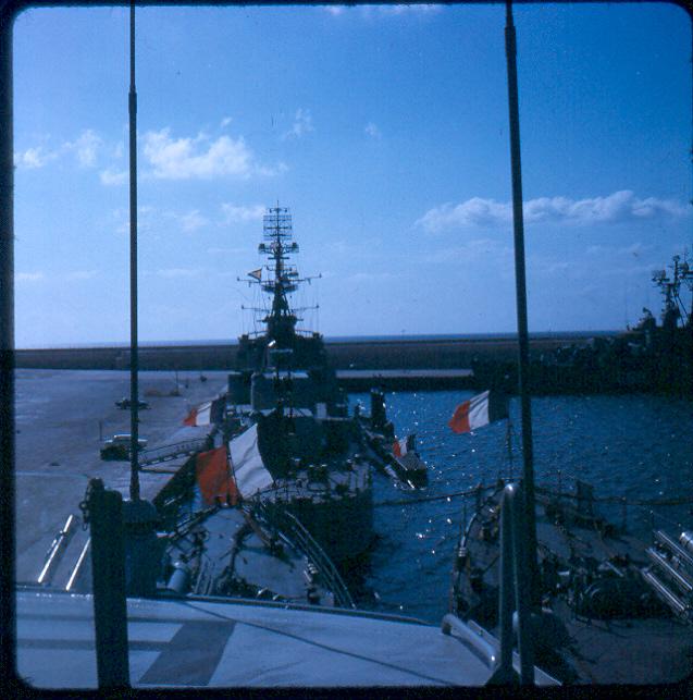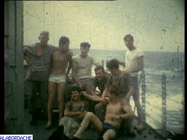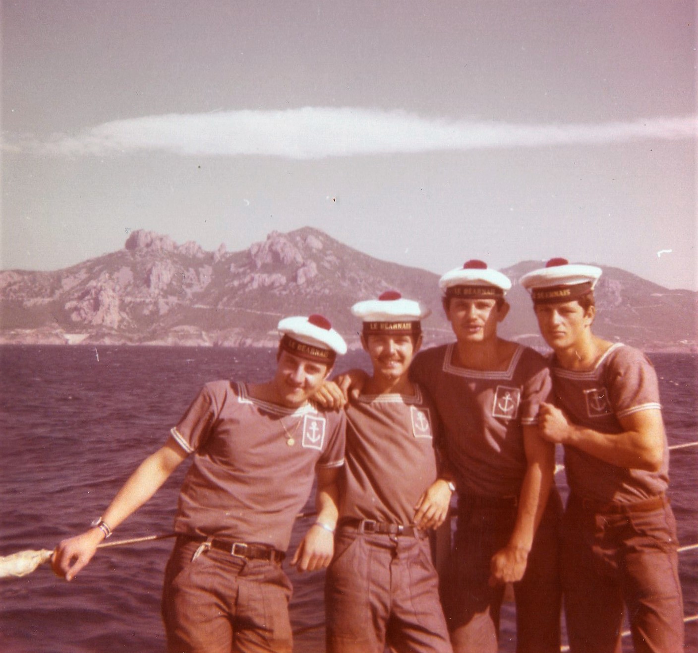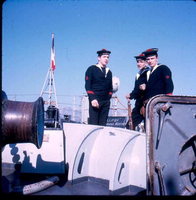 Le Béarnais à Alger juillet 1959. A gauche Lucien Gault dit Charly boulanger, Pierre Martin écouteur mais faisant office de matelot commis et un camarade miltaire chez les Zouaves Charly actuellemnt à touln et Pierrot à Bégard
