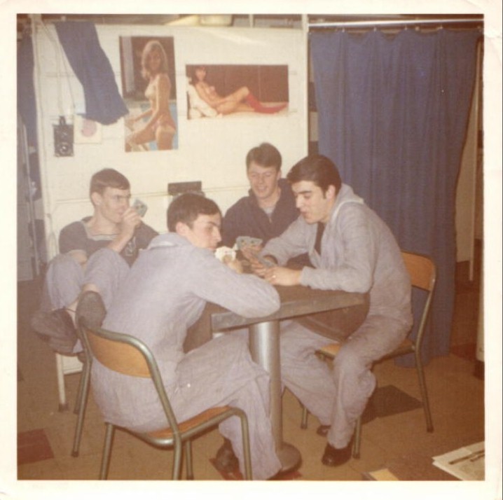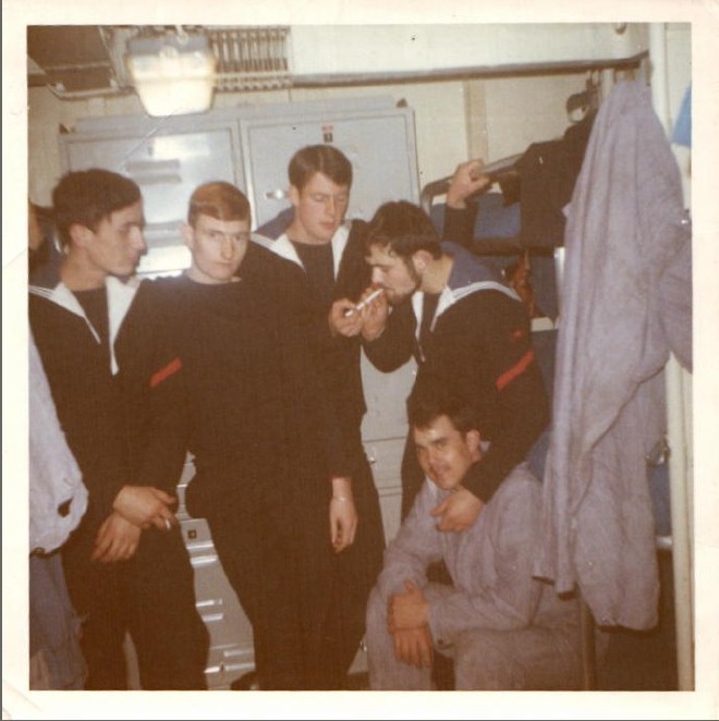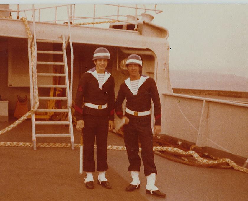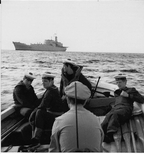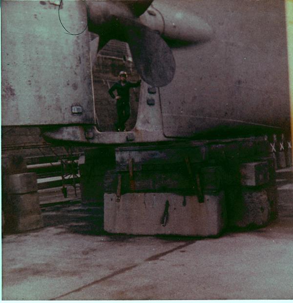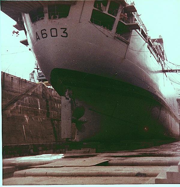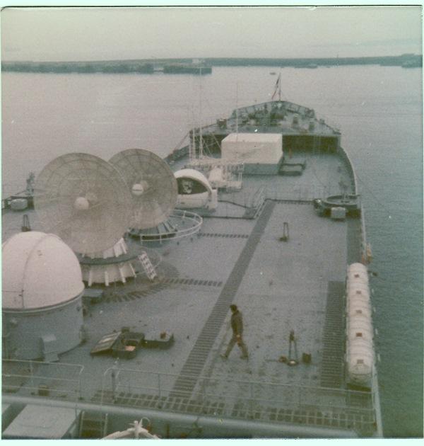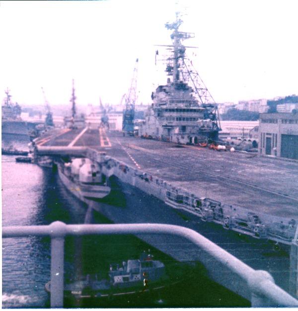 Mise à quai (Foch ou Clem ??) vue depuis le pont d'envol di BEM . 1973