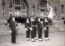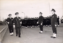 1973/1974 : Cérémonie. Le Capitaine de Vaisseeau Herbout, Cdt du CIN Brest et le garde au drapeau de l'Ecole des mousses. Le maître principal Jacob est le porte-drapeau.