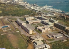Vue aérienne du CIN Brest. Au bout du quai des flotilles on distingue le Richelieu et au quai d'armement un porte avions (Clémenceau ou Foch)