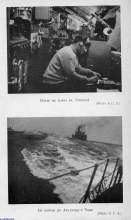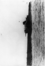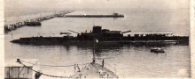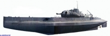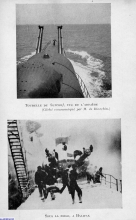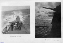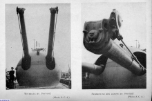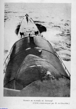 La plage avant et les deux pièces de 203 mm dans leur tourelle étanche, vues de la baignoire. Le télémètre est orienté dns l'axe longitudinal pour ne pas diminuer les performances en plongée du sous marin.
