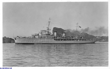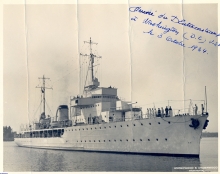 Une jolie vue du D'Entrecasteaux. Cette photo est postérieure à juin 40, après l'armistice. En effet l'aviso porte ses "marques de neutralité" (couleurs du pavillon Français) sur ses tourelles de 138 mm 2 et 3.