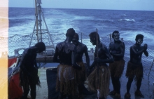 l'équipage au grand complet en baie de Cook au large de Mooréa avant l'appareillage pour Lorient. Mai 1979